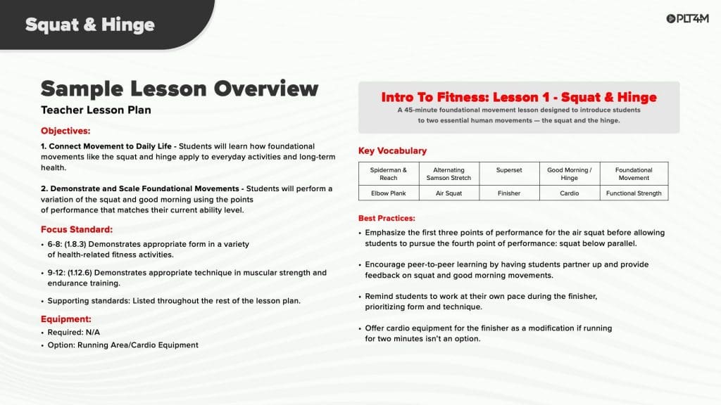 Key Vocabulary (Secondary Specific): Secondary lesson plans include key vocabulary terms tied to the concepts being taught. This supports the cognitive side of PE and helps students describe what they’re learning.